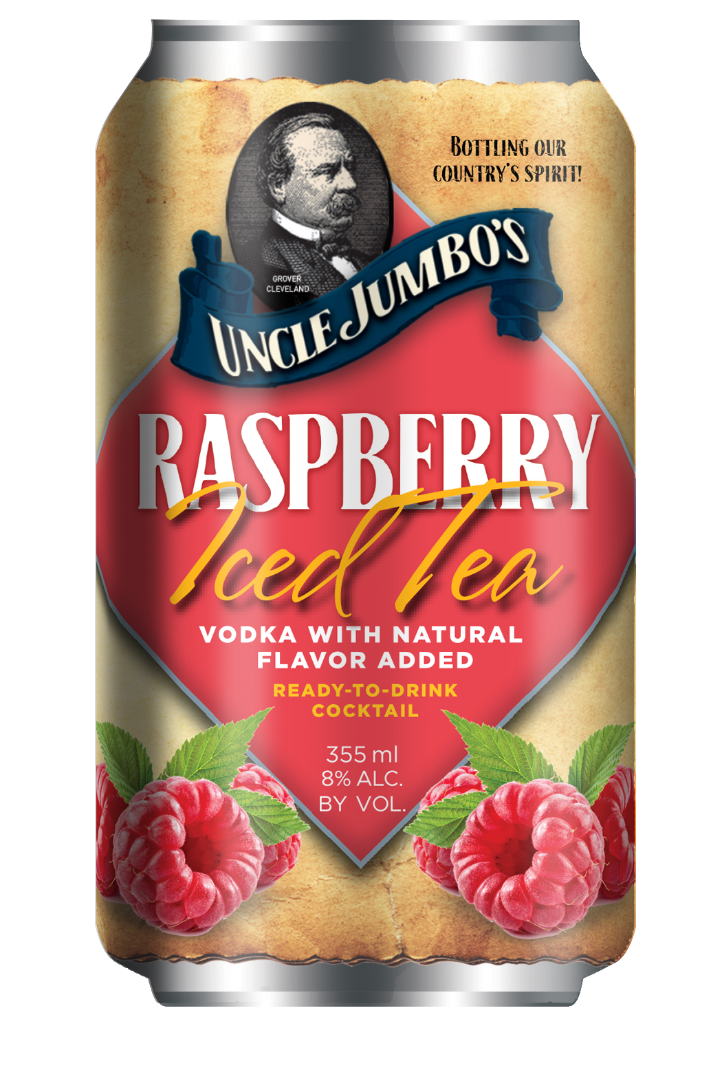 Uncle Jumbo's Raspberry Iced Tea can with vintage design, featuring raspberries and text about vodka cocktail.
