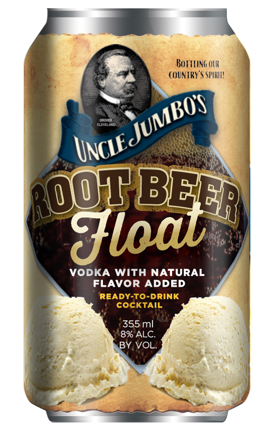Uncle Jumbo's Root Beer Float can, featuring vodka with natural flavors, ready-to-drink cocktail, 355ml, 8% alcohol by volume.