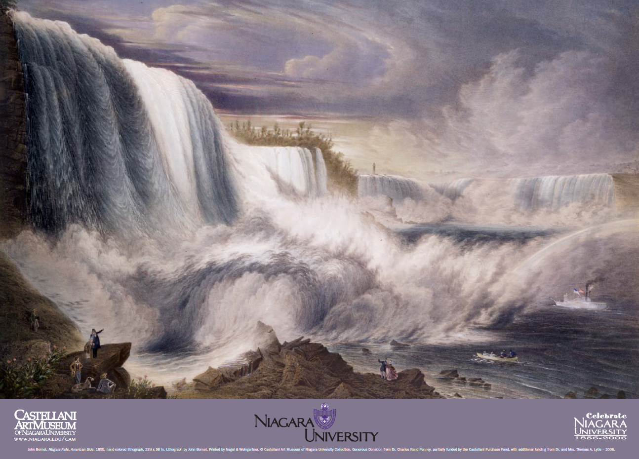 Artwork depicting Niagara Falls with turbulent waters, people viewing the scene from rocky outcrops, and a boat in the water. Lush greenery and a cloudy sky are visible in the background. The image features Niagara University's branding at the bottom View fullsize